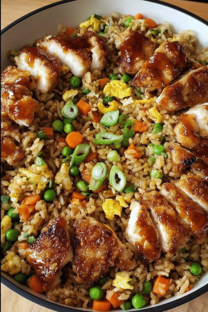 Crispy chicken and veggies tossed in Bang Bang sauce over fluffy fried rice with eggs....