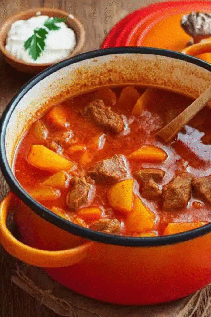 • Savanyított cékla vagy vegyes savanyúság – A savanyú kiegészítők felfrissítik és ellensúlyozzák a gulyás gazdag, zsíros ízét.