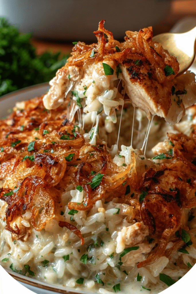 French Onion Chicken Rice Casserole represents the successful evolution of classic French onion soup flavors into practical weeknight dinner format, maintaining beloved taste while adapting to modern time constraints and convenience expectations. This recipe appeals particularly to busy families seeking reliable meals, novice cooks wanting beginner-friendly success, or anyone craving French onion soup’s comforting flavors without the traditional time investment. The efficient use of convenience products—canned soups, rotisserie chicken, prepared rice, French fried onions—demonstrates how thoughtful shortcuts can create genuinely delicious results rather than inferior compromises when combined properly. The beginner-friendly designation accurately reflects the straightforward technique requiring no special skills beyond mixing and baking, making impressive results accessible to those building cooking confidence. The one-dish format naturally simplifies serving and cleanup while the make-ahead capability transforms this into valuable meal-planning tool that reduces daily cooking stress. While the 450-calorie estimate per serving represents hearty nourishment, the complete meal nature means simple additions like salad or bread create fully satisfying dinners without elaborate side dish preparation. For those seeking lighter versions, consider using brown rice, reduced-fat soups and sour cream, less cheese, or increasing vegetable content; though these modifications will alter the comforting richness that defines this casserole’s appeal. Ultimately, this French onion chicken rice casserole deserves permanent status in weeknight dinner rotations as proof that satisfying, flavorful, family-approved meals needn’t require culinary expertise, extensive time, or complicated preparation—sometimes the best cooking comes from understanding how convenience products work together, executing simple techniques properly, and serving with the confidence that a bubbling casserole of creamy, cheesy, onion-flavored comfort represents one of life’s most accessible yet deeply satisfying pleasures.