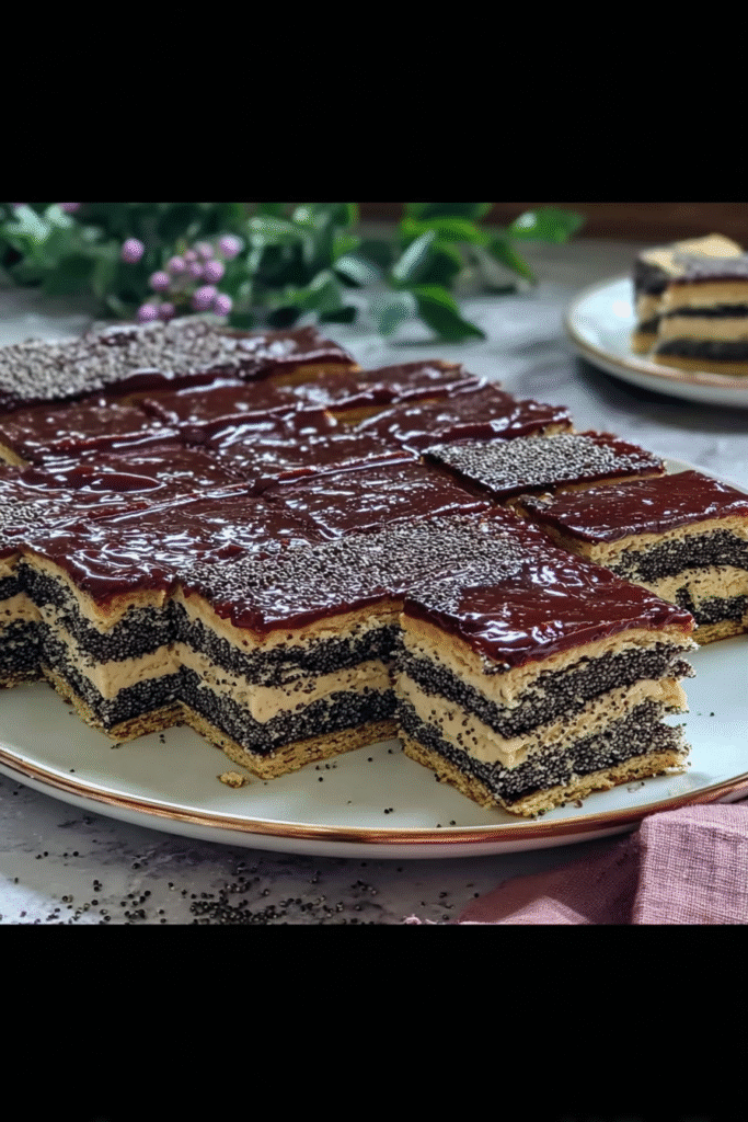 A hármas mákos sütemény egy omlós, vajas tésztából készült rétegelt finomság, amely édes szilvalekvárral, vaníliás mákkal töltött, és fényes csokoládémázzal koronázott klasszikus magyar sütemény. Ez a recept a hagyományos bejgli és a réteges sütemények ötvözete, amely három vékony tésztaréteget egyesít gazdag töltelékkel és elegáns befejezéssel. Az eredmény egy csodálatos szeletekre vágható sütemény, amely ünnepekre és különleges alkalmakra méltó látványt és ízt nyújt.
