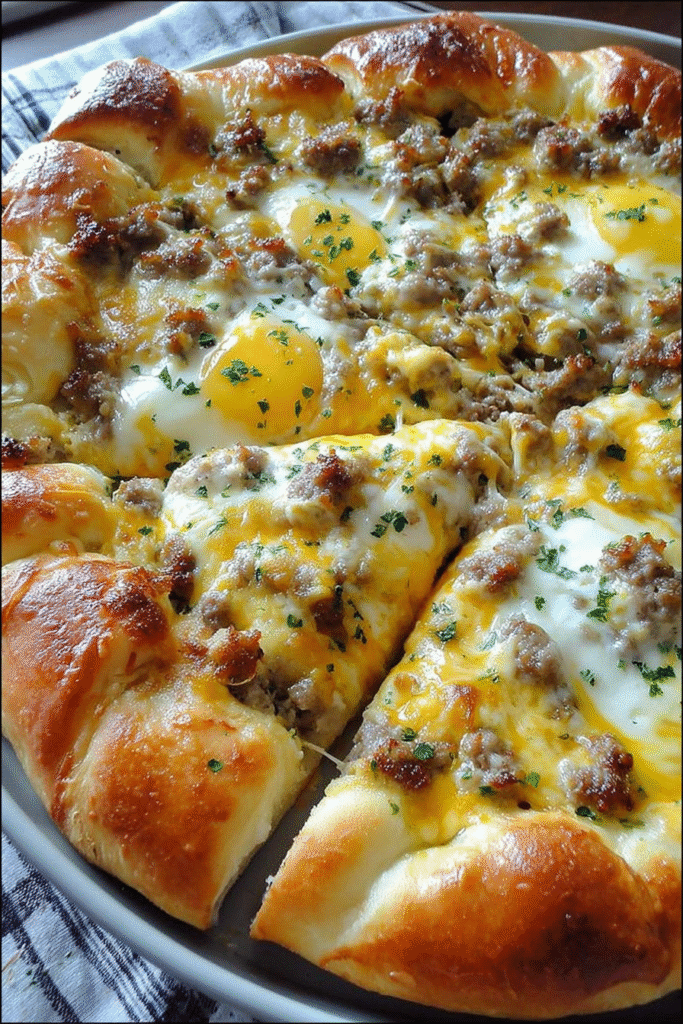 A kolbászos mártásos reggeli pizza egy omlós tésztaalapon krémes kolbászmártással, pelyhes tojással és cheddar-pepper jack sajtkeverékkel megkoronázott laktató fogás, amely újradefiniálja a reggeli élményt. Ez a recept az amerikai reggeli hagyomány minden kedvenc elemét – kolbászt, rántottát, mártást és sajtot – egyesíti egy könnyen fogyasztható pizza formában. Az eredmény egy gazdag, krémes, sajtos reggeli, amely tökéletesen ötvözi a comfort food melegét a praktikus tálalás előnyeivel.