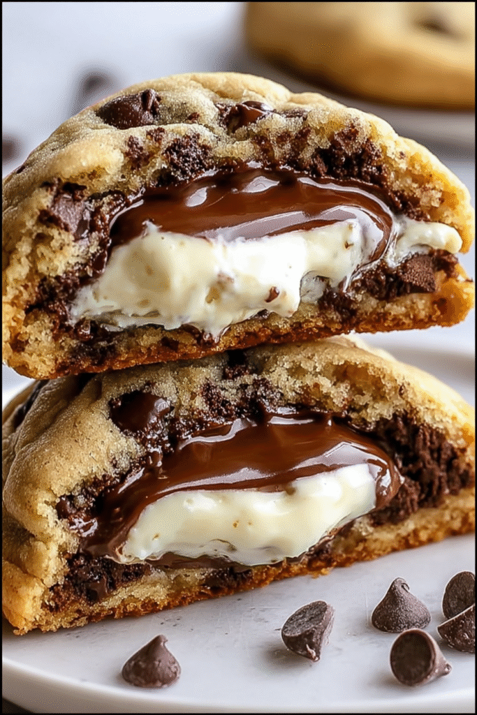 A sajttortás töltésű csokoládéchips süti egy puha, vajas süteménytészta, amely sima, savanykás sajttorta krémet rejt magában, és tökéletes egyensúlyt teremt az édes és savanykás ízek között. Ez a recept az amerikai süteménykultúra innovatív újragondolása, amely egyesíti a klasszikus chocolate chip cookie-t a cheesecake krémességével egyetlen falatban. Az eredmény egy aranybarnára sült, ropogós szélű, de puha közepű sütemény, amelynek belsejében meglepetésként felbukkan a krémes sajttorta töltelék.